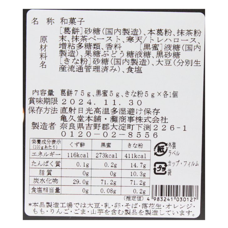 食べれば笑顔になるモチっと食感の吉野葛を使った抹茶味の葛餅。喉ごしもよく、そのまま食べてでも美味しいですが冷蔵庫で冷やすとより一層美味しく頂けます。ギフトにもらっても嬉しい一品です。