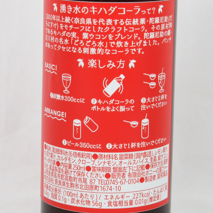 陀羅尼助をモチーフにしたクラフトコーラです。キハダの実と紫ウコンをブレンド!ほのかな苦みと喉ごし、スッキリとした柑橘系の香と味で大人向けです。あの天川村の名水【ごろごろ水】使用。
