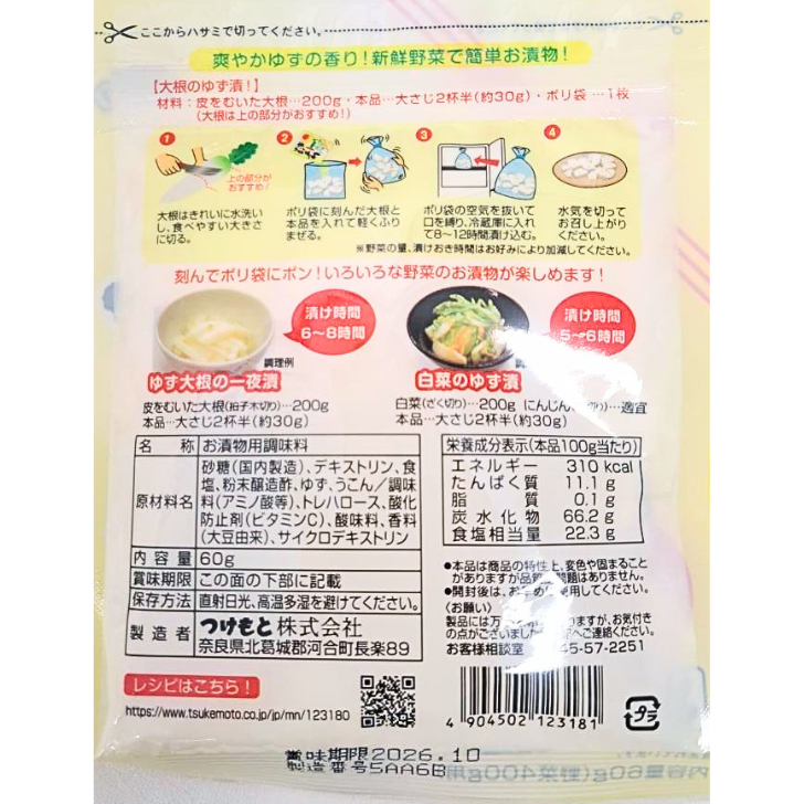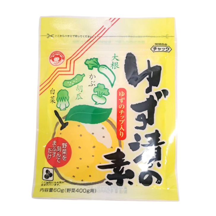 ゆずの配合にこだわった少し甘めの漬け上がり♡ゆずチップ入りで新鮮野菜にまぶして簡単お漬物で食卓にもう一品プラス♪ポリ袋でも簡単にできるのでお子様と一緒にお漬物作りなんていかがですか?