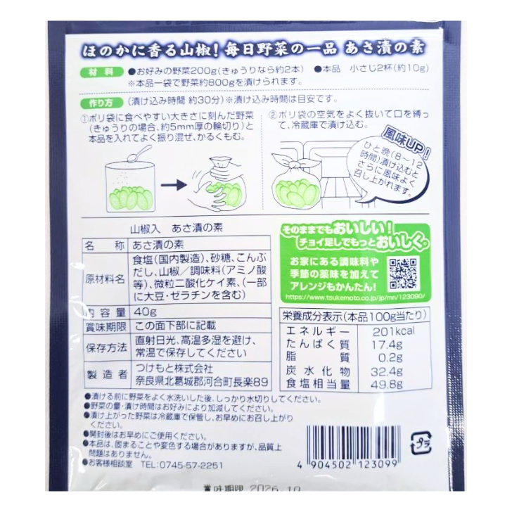 1袋で野菜約800gが漬けられます!シンプルな旨味とほのかに香る山椒がアクセント。粉末ならではの浸透圧を利用し、野菜自身の水分と混ざり合う素材の味を損なわないおいしい漬け上がりです。