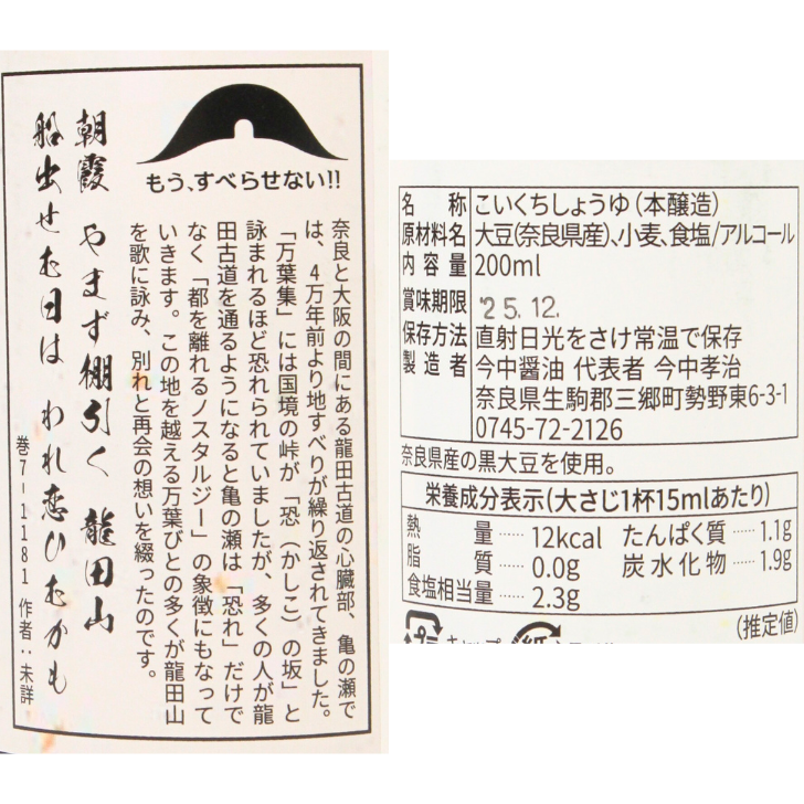奈良と大阪の間にある瀧田古道の亀の瀬で熟成させた、今中醤油自慢の特選黒豆醤油。風味豊かで刺身やかけ醤油の他、焼き物にもおすすめです。